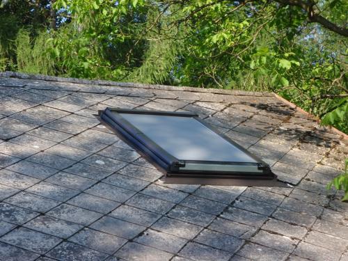 Střešní krytina Eternit byla položena na bednění a dala se rozebrat bez velkých ztrát. Použili jsme proto "staré šablony" zpět a střecha vypadá, že tam byla střešní okna již od začátku.